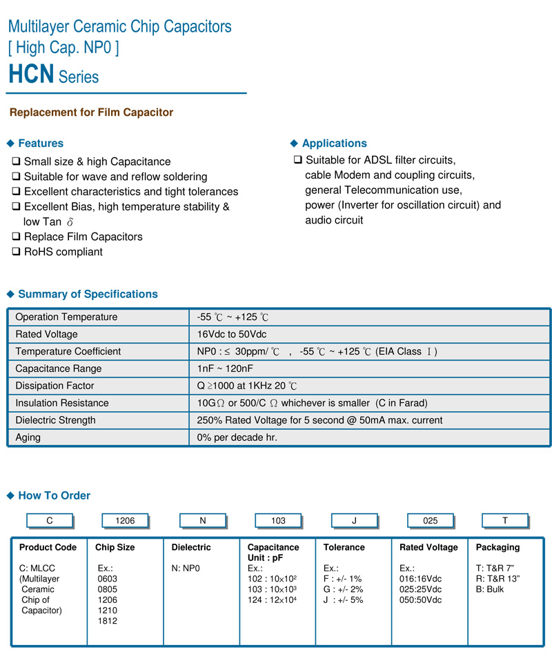 贴片电容 高容NPO电容 容量大于1.0nF HCN系列