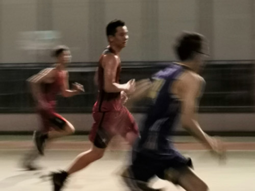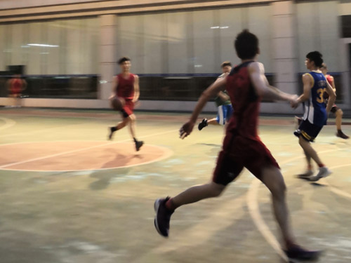 我司队员上场就旗开得胜,抢到首球,之后传给进攻队员。敌方也是高手如林,防守严密,没有一丝松懈。眼看着进攻时间就要到了,我司11号队员的身影一闪,虚晃一抢,似乎要拿球,转移对手注意力,持球队员趁机冲锋上篮。