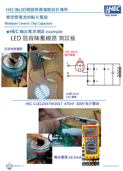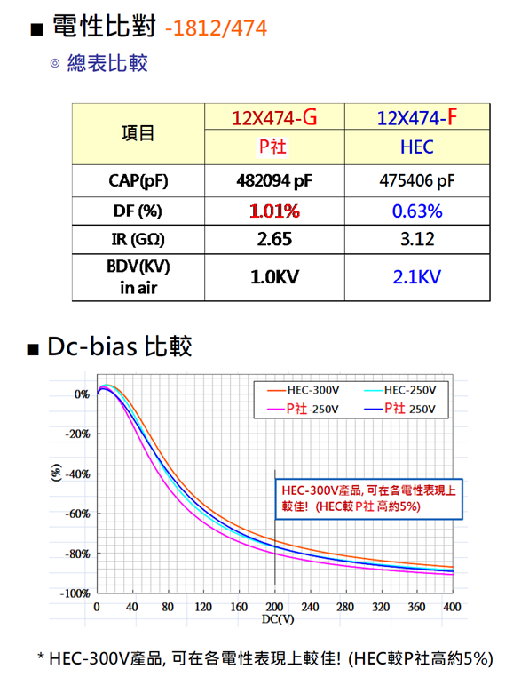 今年5月底针对客户投诉较多,不良率较高的,厚度为2.5mm之 P厂商的电容器与HEC之新品(厚度为2.0mm)进行了分析比对,因为HEC使用的是贵金属材料,而并非普通材料!在下列状况有明显改善:(1)容衰减少 功率稳定(2)耐压值提升(3)针对AC220V设计(4)抗弯力提升