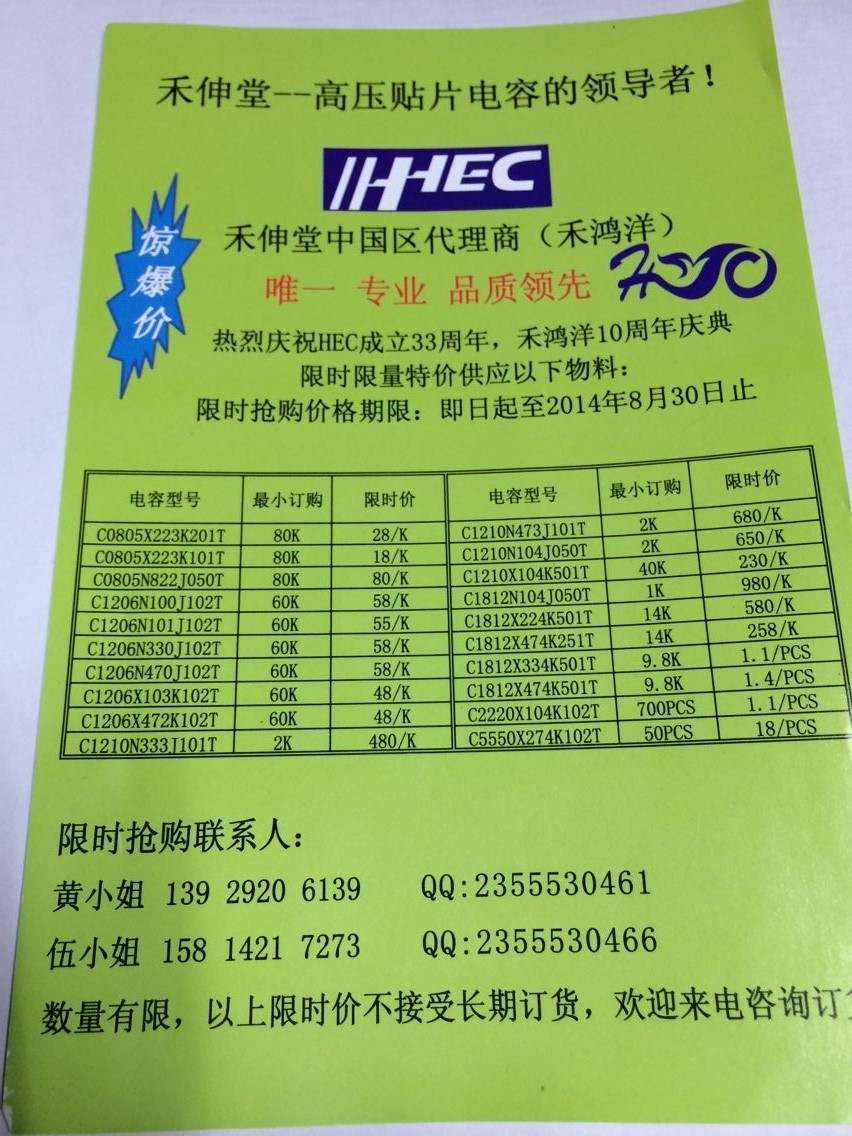 |感谢你们的支持|禾鸿洋会更加努力,感谢我们的团队,我们一起携手走过了10周年,有你们是禾鸿洋的骄傲,前面的路还很长,有坦途也会有荆棘坎坷,但更有光明大道,为了我们筹备好云南之前的经费,实现我们短期的理想与成果,同时感谢广大客户的支持,我司决定降价大让利。。。火力全开。。。电容负利润出售!