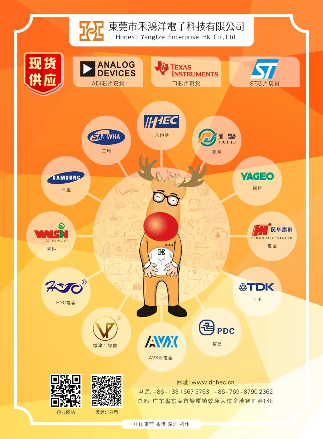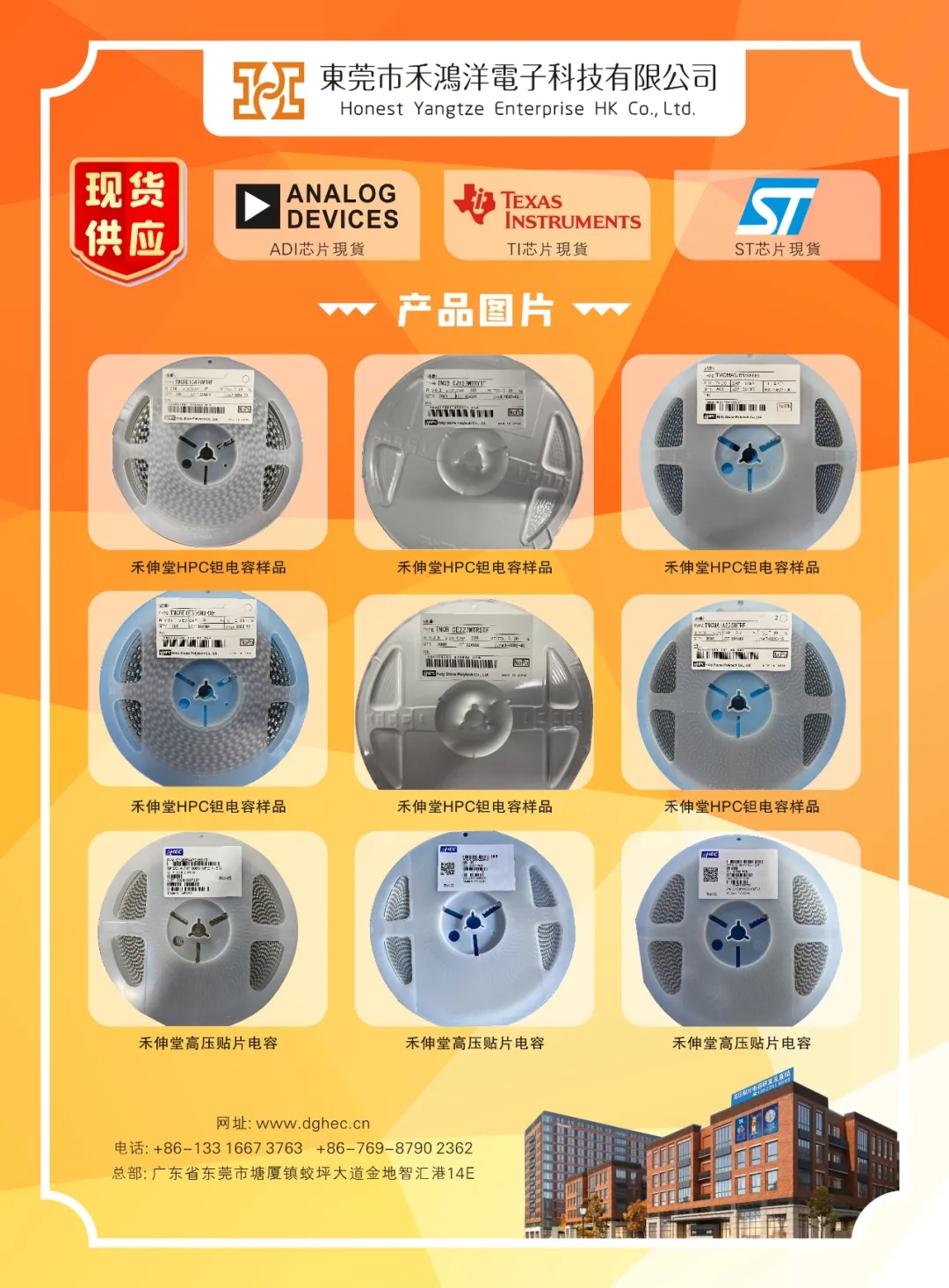 禾鸿洋代理国际品牌:台湾禾伸堂、韩国三和;销售:信昌,国巨,华科,太阳诱电,TDK,村田,三星 等。